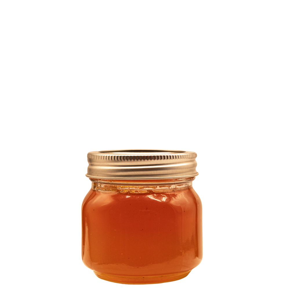 8 oz. glass jar. Honey, 1/2 lb. by weight.